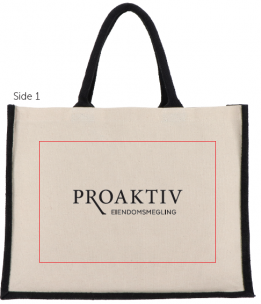 Totebag i jutebomull øko-tex. Str 42,5 x 19 x 32 cm.Proaktiv logo på en side i str 18 cm.